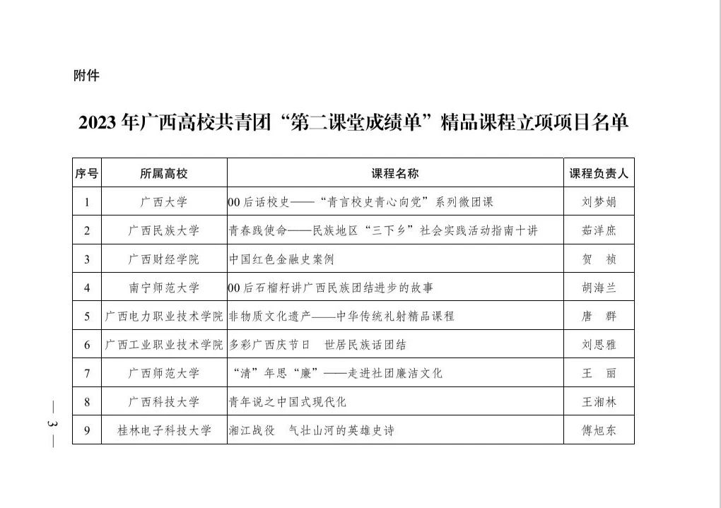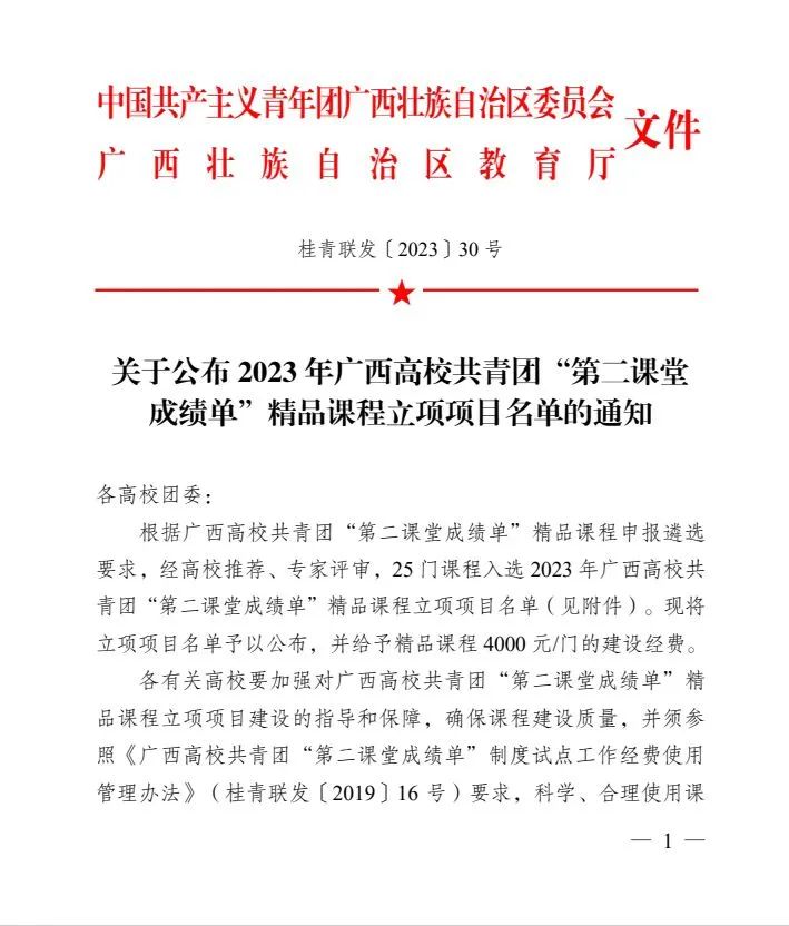 根据广西高校共青团“第二课堂成绩单”精品课程申报遴选要求,经高校推荐、专家评审,最终有25门课程入选 2023 年广西高校共青团“第二课堂成绩单”精品课程立项项目名单。