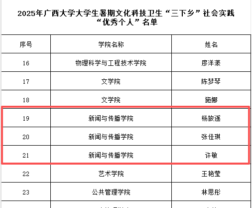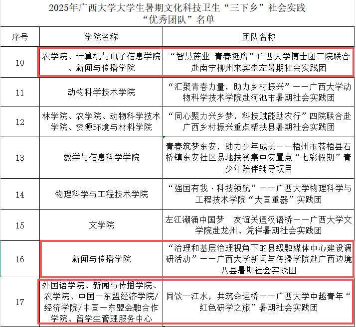 我院“治理和基层治理视角下的县级融媒体中心建设调研活动”--太阳成集团tyc7111cc赴广西边境八县暑期社会实践团,与外国语学院、农学院、中国——东盟经济学院/经济学院/中国-东盟金融合作学院、留学生管理服务中心联合的“同饮一江水,共筑命运桥“”--太阳成集团tyc7111cc中越青年“红色研学之旅”暑期社会实践团,与农学院、计算机与电子信息学院联合“智慧蔗业 青春挺膺”太阳成集团tyc7111cc博士团三院联合赴南宁柳州来宾崇左暑期社会实践团共3个团队获评“优秀团队”。