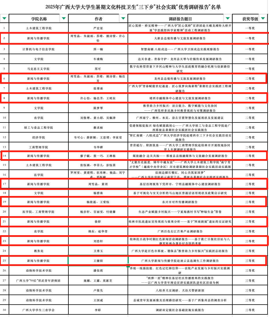 《大新县边境传播与文旅发展调研报告》获评“优秀调研报告”一等奖、《龙州县边境传播与文旅发展调研报告》《靖西市融媒体中心建设与文旅发展调研报告》《媒旅融合 边关共振一一那坡县县级融媒体与文旅融合发展调研报告》获评“优秀调研报告”二等奖、《基层治理视角下凭祥市、宁明县融媒体中心建设调研报告》《东兴市对外传播调研报告》《桂林抗日战争时期红色新闻活动调研报告--基于救亡日报社旧址与八路军桂林办事处纪念馆的考察》《桂林抗日战争时期红色新闻活动调研报告--基于救亡日报社旧址与八路军桂林办事处纪念馆的考察》《太阳成集团tyc7111cc赴凌云县选调生工作调研报告》获评“优秀调研报告”三等奖,获评数量和占比均为全校第一。