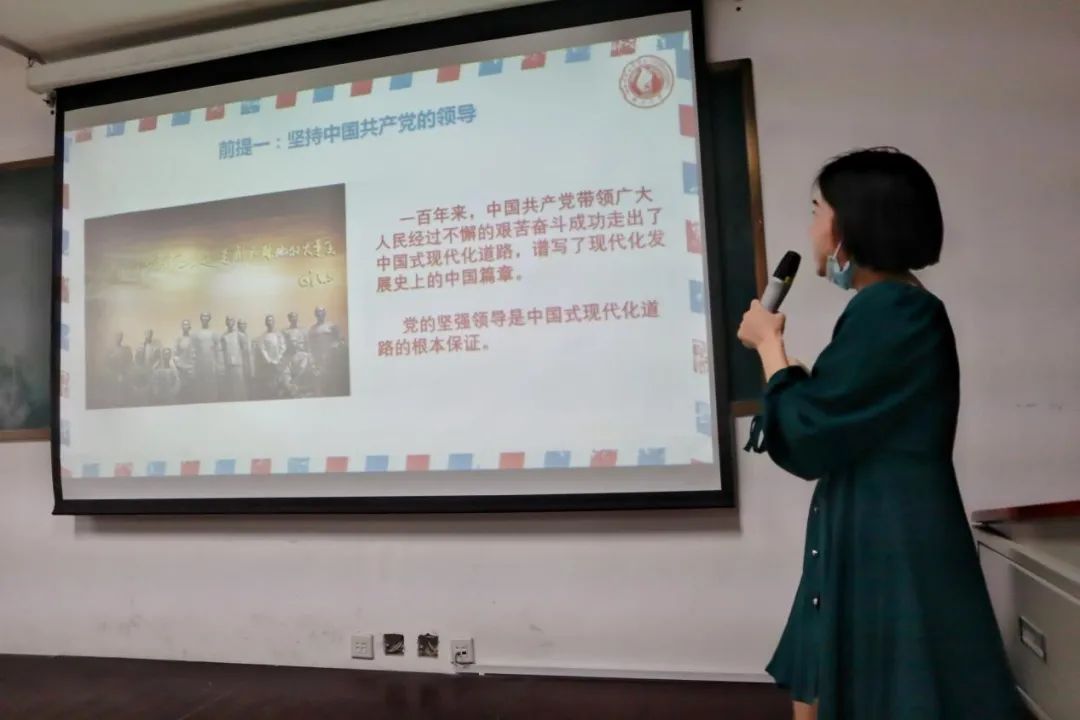 活动伊始,“君武讲师团”的两位成员以“中国式现代化”为主题向参与活动的同学进行宣讲。来自土木建筑工程学院本科四年级的易书帆从三个前提出发,向大家引入了中国式现代化主题。中国式现代化是区别于西方以资本为根本前提的现代化,是坚持中国共产党的领导、把人的全面发展置于核心地位、扎根中国国情的现代化。她指出,中国式现代化既有各国现代化的共同特征,更有基于国情的中国特色,其内涵是中华民族伟大复兴式现代化、中国社会主义现代化、独自自主、自立自强现代化、后发赶超并联式现代化。这是“中国式”的道路,是从中国历史发展进程中不断探索而积累的宝贵经验,具有重大历史意义。