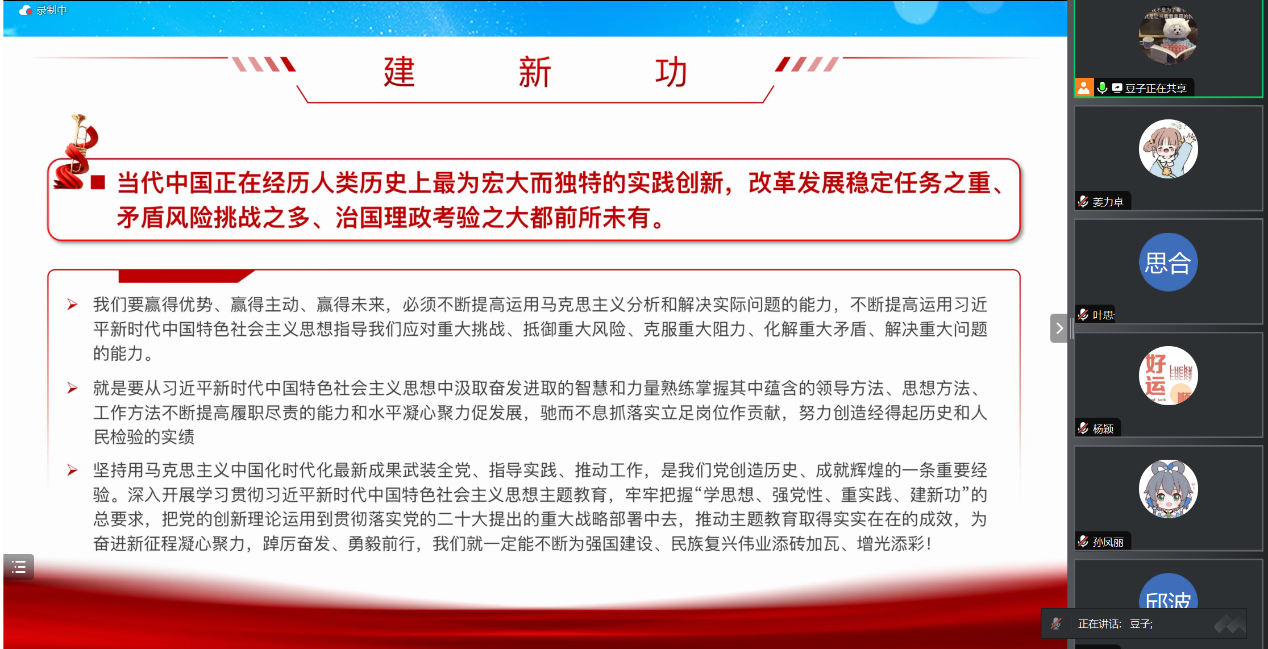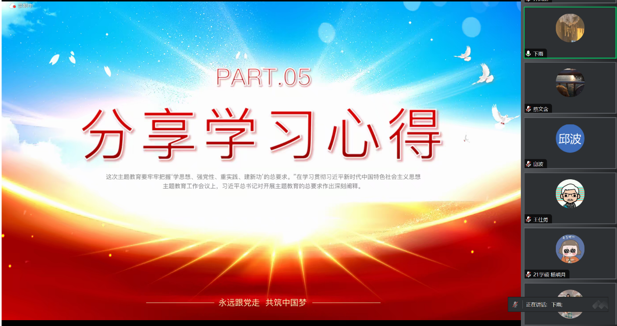 随后,参会党员分享学习感悟并逐一发言。李夏宇同志指出,当前,全党正在深入开展学习贯彻习近平新时代中国特色社会主义思想主题教育,党员同志应当自觉用习近平新时代中国特色社会主义思想来武装头脑,指导实践。
