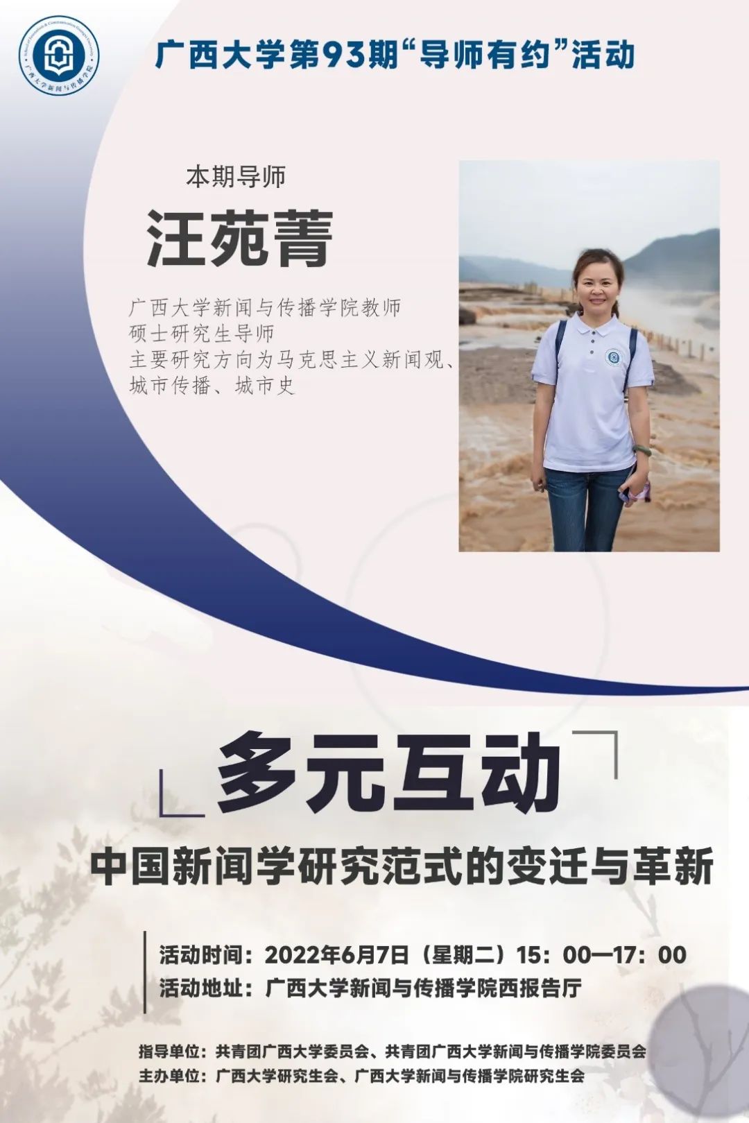 本次活动将邀请学院汪苑菁导师,以“多元互动:中国新闻学研究范式的变迁与革新”为讲座主题,向同学们讲授当下新闻学研究的前沿理论,如当下新闻学研究的范式演变与创新,当下新闻学研究范式之间关系,以及新闻学范式革新对理论与实践产生的影响。