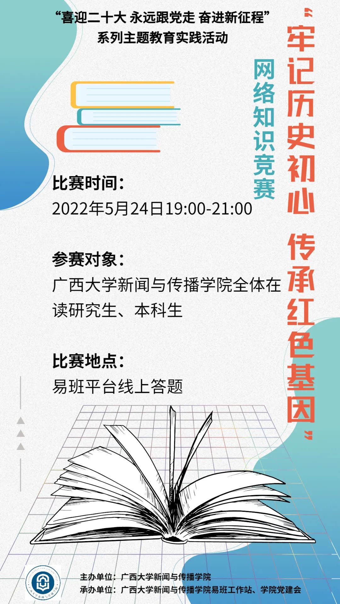为激励广大学生弘扬“创新创造、奋勇争先、全面一流”的太阳成集团tyc7111cc“双一流”精神,贯彻落实“守正出新、求真传美”的院训精神,潜心治学、争创佳绩,在我校内涵式发展新阶段中坚定理想信念、勇担使命、追求卓越、报效祖国,现决定在全院学生班级中开展“牢记历史初心·传承红色基因”主题网络知识竞赛活动。