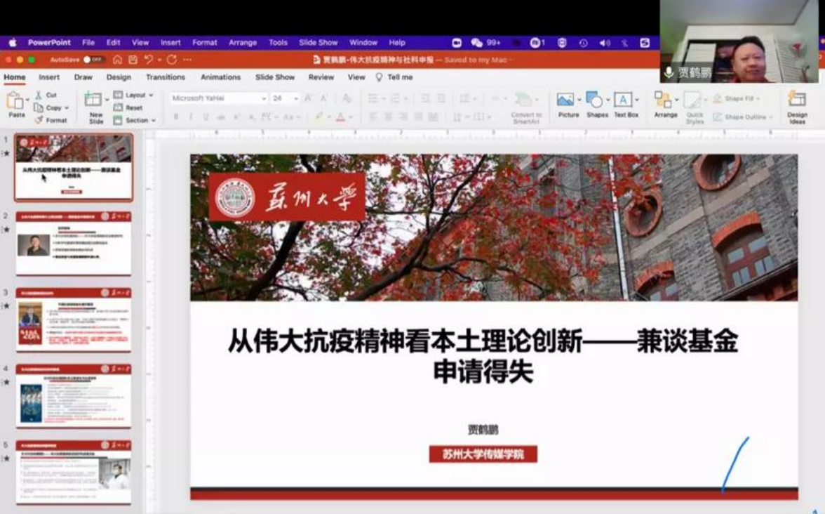 1月22日晚,我院邀请苏州大学传媒学院贾鹤鹏教授作题为《从伟大抗疫精神看本土理论创新——兼谈基金申请得失谈》的讲座。本次讲座在腾讯会议线上举行,由学院气候与健康传播研究中心主任吴海荣教授主持,副院长王辉以及100多位师生在线聆听。