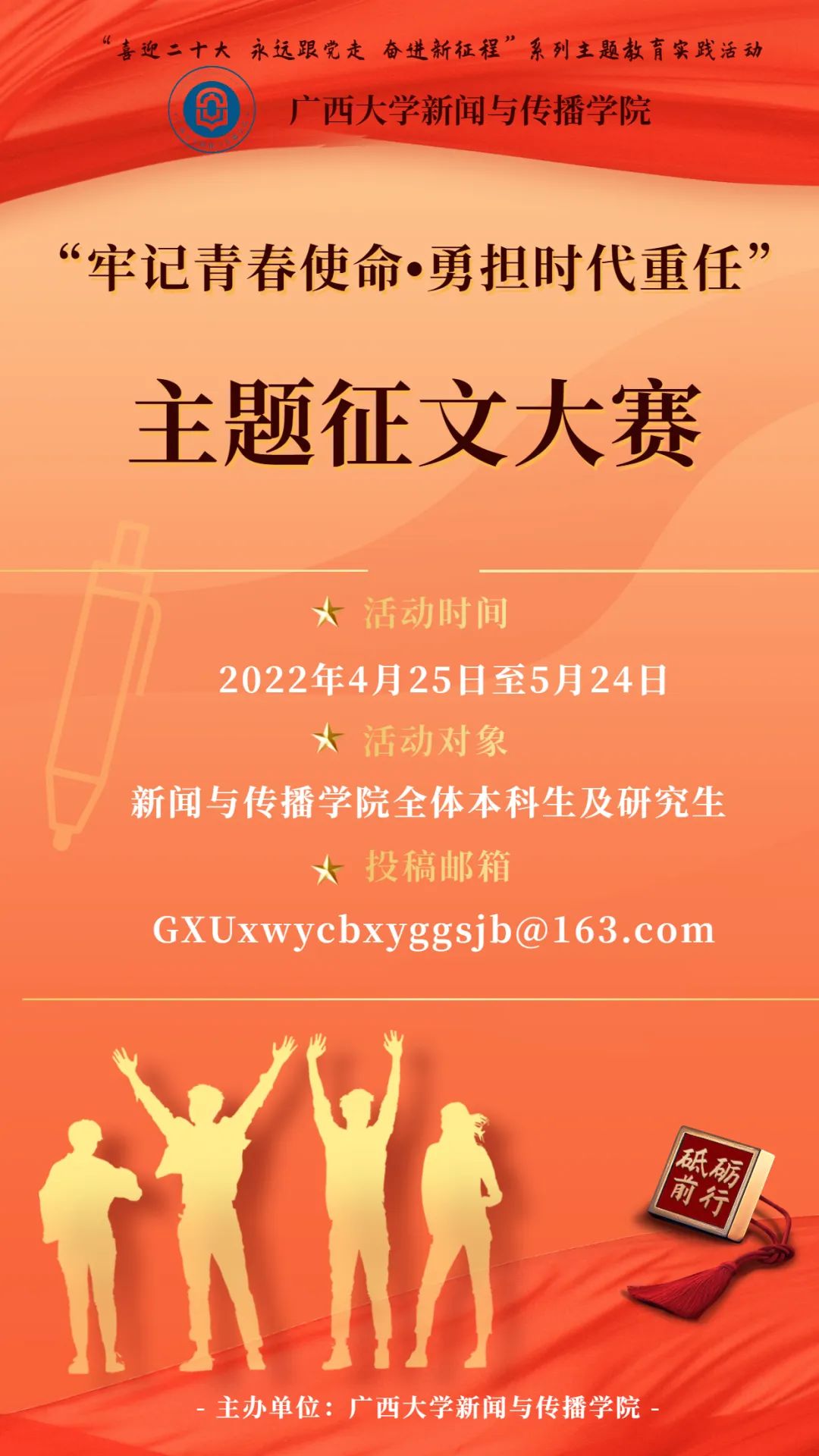 为迎接党的二十大的胜利召开,积极响应学校开展的“牢记青春使命•勇担时代重任”主题政治学习活动,鼓励广大学生弘扬“创新创造、奋勇争先、全面一流”的太阳成集团tyc7111cc“双一流”精神,潜心治学、争创佳绩,在我校内涵式发展新阶段中坚定理想信念、勇担使命、追求卓越、报效祖国,我院决定开展“牢记青春使命•勇担时代重任”征文大赛。
