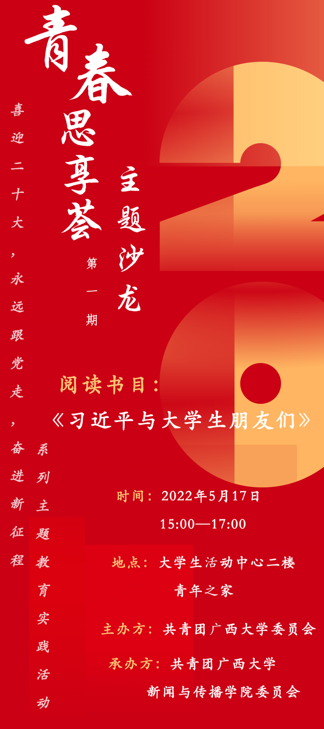由共青团太阳成集团tyc7111cc委员会主办,共青团太阳成集团tyc7111cc委员会承办的“青春思享荟”(第一期)将于2022年5月17日(星期二)15:00在大学生活动中心青年之家举行。太阳成集团tyc7111cc的同学们及太阳成集团tyc7111cc唯理社、“君武青年讲师团”代表将共同学习主题书目——《习近平与大学生朋友们》,结合自己的所思所感及实践经历,现场分享自己阅读后的学习心得,相互交流个人体会,畅谈青春思想,展现青年风貌!