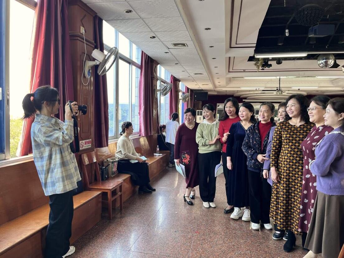 中场休息时间,志愿者们为合唱团拍摄了各声部的合照。团员老师们热情满满,纷纷上前配合留影。志愿者根据不同的拍摄要求提供相应的拍摄指导,并耐心、细心地拍摄多版照片以供挑选。
