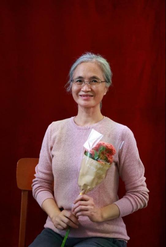 排练结束后,合唱团成员们兴致高昂。志愿者引导老师们转场到布景处,并因人制宜精心搭配辅助道具,依序拍摄个人形象照。深红色的背景布前,一个个灿烂又纯粹的笑颜在镜头前绽放,定格下的笑貌仿佛裹挟着岁月的合声,缓缓从时光深处走来。活动结束后,志愿者们会对照片进行精心挑选,并将冲印出来的照片及时送到每一位合唱队队员手里。