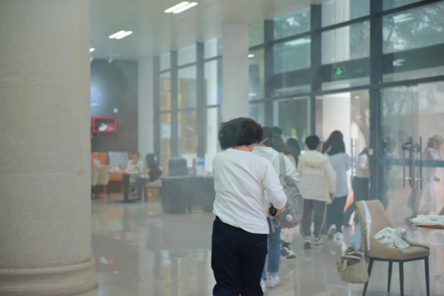 伴随着急促的警报声,消防演练拉开帷幕,各岗位人员进入临战状态。学院分管领导、辅导员呼叫疏散:“大家请注意:本大楼发生火灾,请从最近的门口有序撤离。”疏散引导人员在安全通道的出口做疏散引导工作,接应师生往下、往外疏散。学院师生弯腰曲背、捂住口鼻并按照指定路线撤离,整个过程有条不紊。