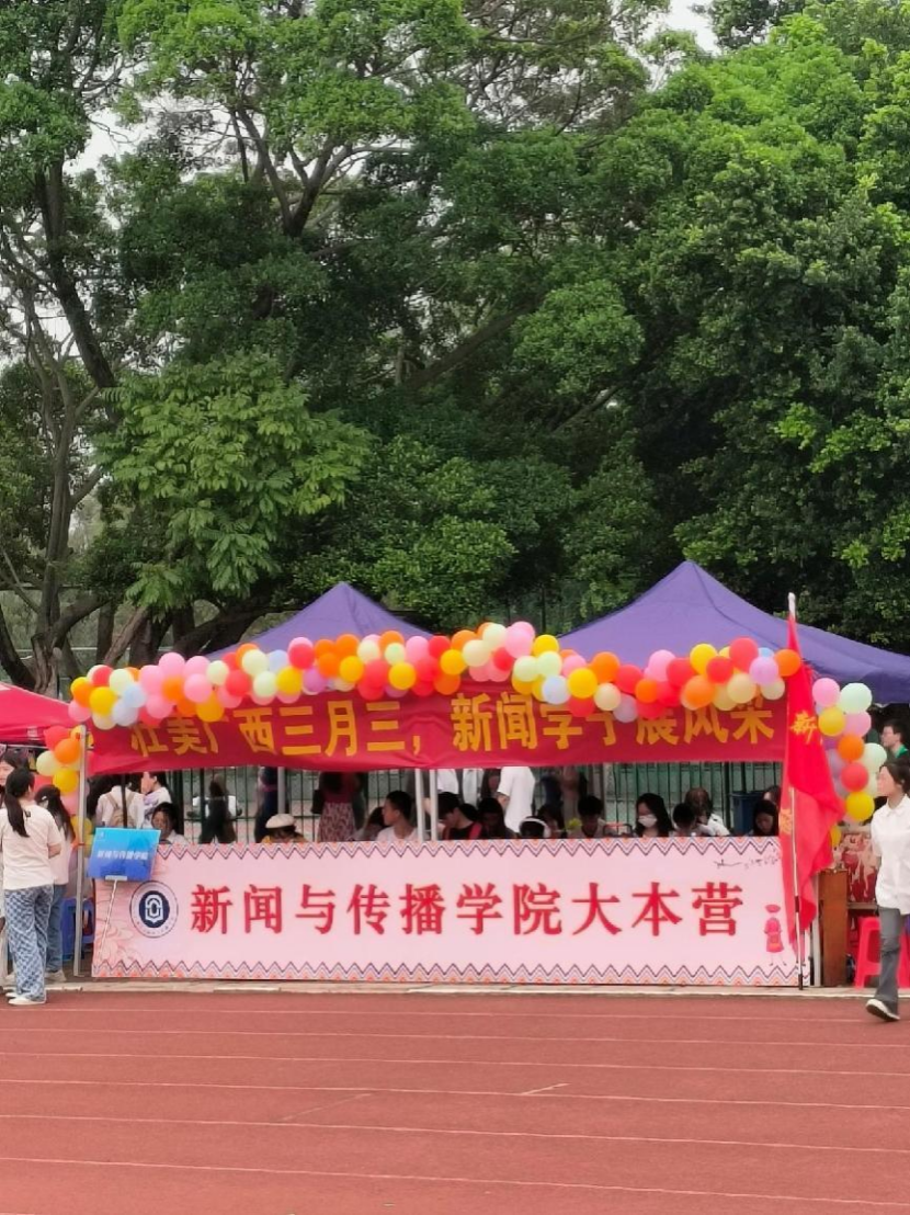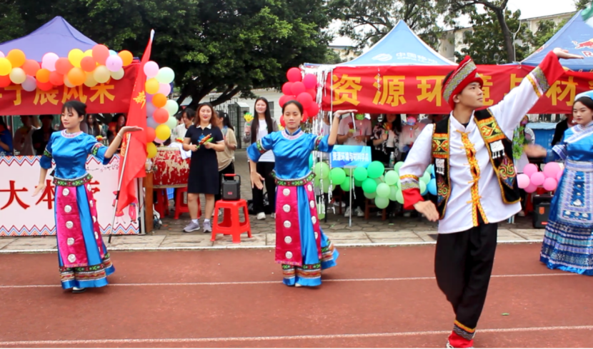 广西“三月三”自然少不了山歌对唱。我院学子与资源环境与材料学院的同学合作表演对山歌,为此次活动增添民俗氛围。表演的同学身着民族特色服装,大本营内的同学们挥动拍手、敲响大鼓,为表演的同学打节拍,优美的民族舞蹈和悠扬的歌声吸引来大批观众围观。