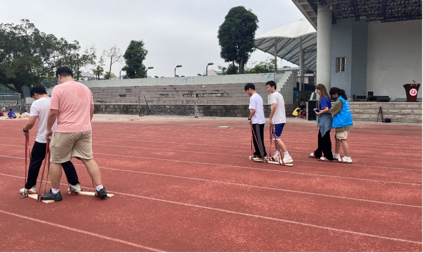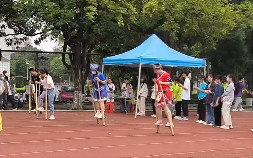 双手紧握、保持平衡、稳步前行,在高脚马项目中,同学们开展紧张却趣味十足的比赛,感受不一样的“奔跑”。