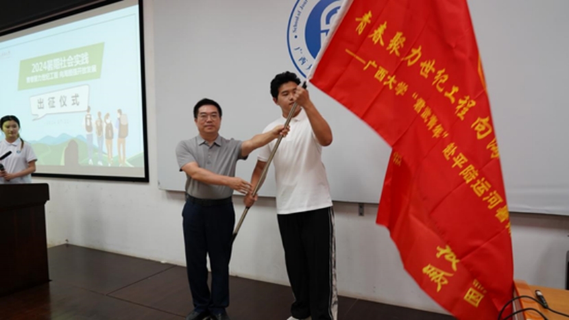 随后,银健书记向学生代表李信诺授旗,寄语青年们要走出校园,深入社会,将个人理想融入国家发展,通过实践锤炼自我,为国奋斗。旗帜飘扬,指引青年们向梦想前进,在社会实践中增长见识、拓宽视野、磨练意志、砥砺品格。