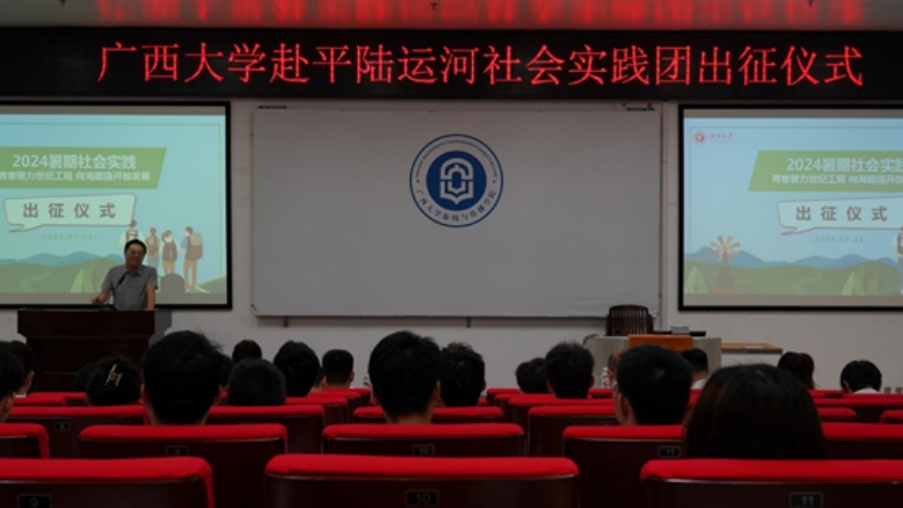 出征仪式现场,太阳成集团tyc7111cc党委书记银健老师发表讲话。他指出,刚刚召开的党的二十届三中全会出台了《中共中央关于进一步全面深化改革、推进中国式现代化的决定》,平陆运河工程是广西壮族自治区在推动中国式现代化、推动壮美广西建设的一项重要举措,受到中央、自治区和我校的高度重视。我校四院联合组织的聚焦平陆运河工程建设的暑期社会实践调研团正当其时、恰逢其势。银健书记强调,在此次社会实践的过程中,团队成员应牢固树立安全意识、专业意识、问题意识和成果意识,真正做到受教育、长才干、做贡献,把青春的汗水和智慧的火花,挥洒在壮丽的广西建设之中,为推进中国式现代化的伟大征程贡献力量。