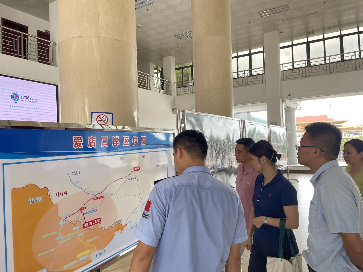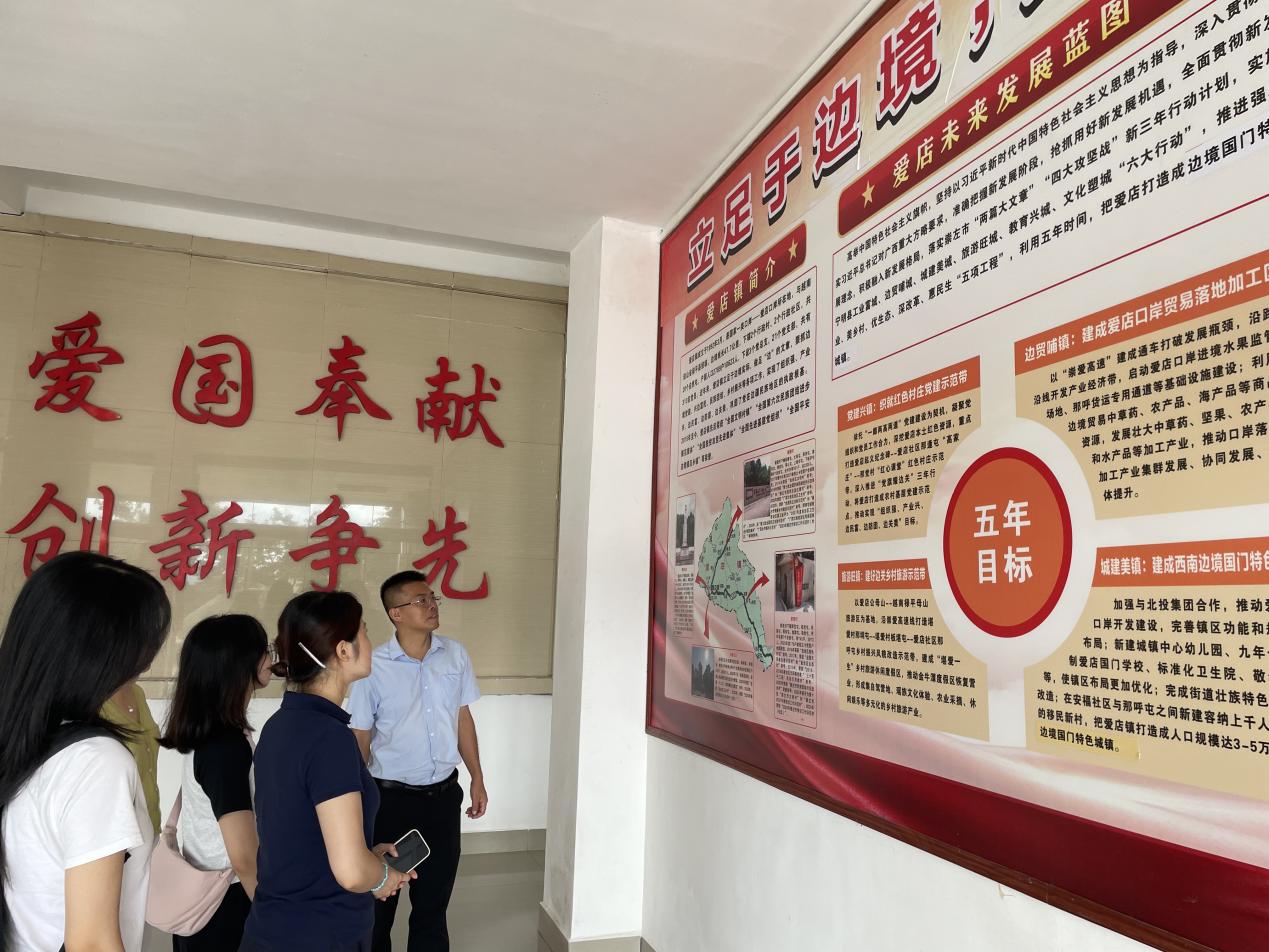 实践出真知,调研组随后前往爱店口岸以及广西兴边富民示范村——“堪爱村”进行实地参观,并参观体验了“国门书吧”和爱店口岸的旅检流程,实地感受中越货运往来。在堪爱村,调研组参观了堪爱村的党群服务中心的民族团结进步展示馆,感受当地的民俗文化以及旅游潜力。