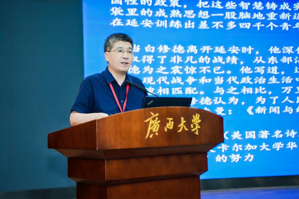 西北大学新闻传播学院教授王春泉作题为《延安时期新闻学自主性知识体系的创造性建设》的报告。他强调,延安时期在中国新闻学发展史上具有重要地位,这一时期构建了具有中国自主性的新闻学知识体系。报告回顾了延安时期新闻学的革命性创新,以及《解放日报》改版等具体实践。同时,报告还列举了唯物主义新闻学、实事求是等标识性概念,展现了延安新闻学的理论框架。