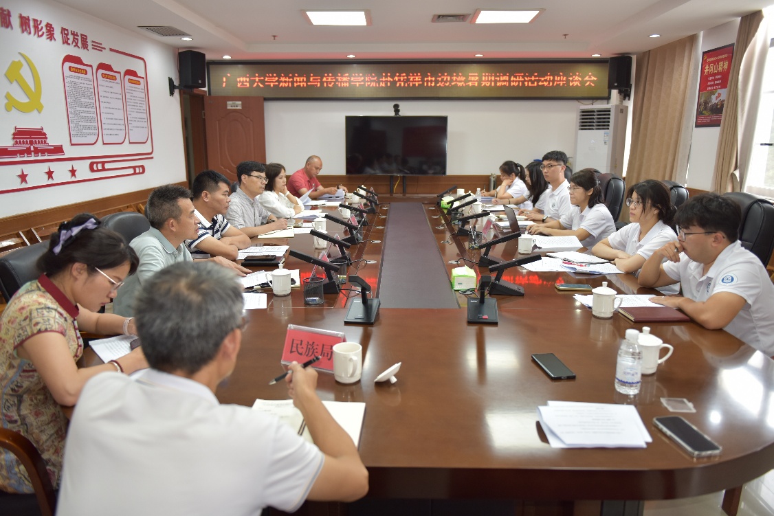 调研首日,8人团队在凭祥市委宣传部召开专题座谈会,凭祥市委宣传部部务委员、边境对外宣传中心主任许建恒、文旅局副局长黄建雄、融媒体中心综合管理部主任唐妃琴、民族局民宗中心副主任邱国睿、应急管理局副局长郭辉德、政法委副书记黄波、大数据办技术股业务骨干韦伟等部门分管领导及业务骨干参加会议。座谈会围绕边境融媒体建设、文化旅游发展、国际传播实践与基层治理等主题展开,重点探讨了跨市文旅资源整合、基础人才队伍建设、智能联防联控、跨境自然灾害防治、乡村数字化治理、社交平台接入和非遗文化传承等工作内容,旨在深入研究边疆治理与文明互鉴经验,为地方发展及国家决策提供扎实参考。