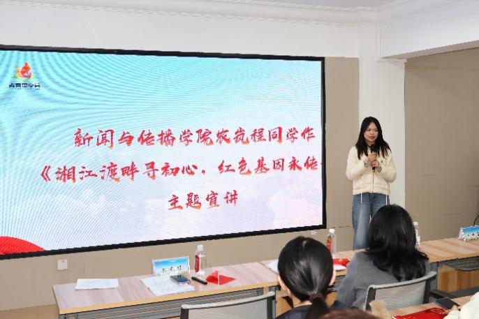 农岚程同学以“牺牲、守护、追寻、出发”四个关键词,分享了对长征精神的理解。她表示,作为新闻学子,应以笔为刃、以镜头为窗,成为红色基因的记录者、传播者和阐释者,在新媒体环境下通过微短剧等创新形式,让湘江战役的红色故事广泛传播。