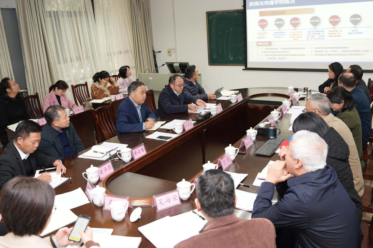 随后召开的座谈会上,学院院长王仕勇围绕学院发展历程、“十四五”期间工作成效、“十五五”发展目标与重点任务,以及请求学校支持事项等方面作了汇报。他表示,学院自1972年开办新闻学本科以来,始终坚持特色发展,在马克思主义新闻观教育、面向东盟的国际传播等领域形成明显优势,近年来在课程建设、学科竞赛、科研立项等方面取得一系列突破,但在博士点申报、师资规模、经费支持等方面仍面临发展瓶颈,希望学校在学科建设、专业拓展、条件保障等方面给予更多支持。