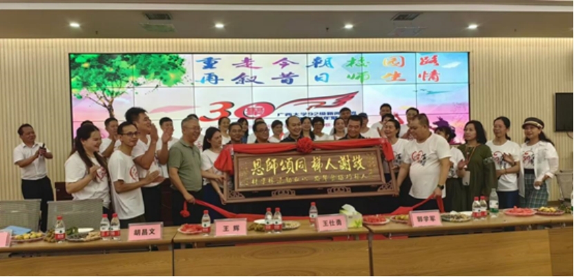座谈会由92级校友黄国辉担任主持人。黄国辉首先表达了对学院及教师们的感激之情,简要介绍了班级同学们目前的职业发展现状。随后,学生代表向学院赠送感恩母校和恩师培养的匾额,以此表达学子对学院深厚的情感。