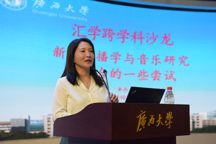 活动现场,不同学科领域的老师进行学术交流。艺术学院副院长欧阳宜文就国际音乐交流在我国面向东盟国家话语中的功能研究和定性比较分析(QCA)视角下的广西壮族音乐传播研究两个案例向大家分享了她对新闻传播学与音乐研究相结合的一些尝试。