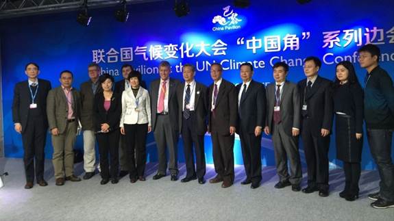 图为参加气候传播国际边会嘉宾合影(左四为范恒山,左五为郑保卫,左七为海清,左八为黄浩明,右一为王彬彬)