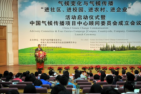 为了气候变化与气候传播从项目中心致力拓展的国际舞台走向社会,走向民间,实现“内在化”,按照“两路并进、双向使力”的理念,2012年6月2日,项目中心与中国人民大学新闻与社会发展研究中心、乐施会、中国人民大学新闻学院等单位,在中国人民大学举共同主办了气候变化与气候传播“进社区、进校园、进农村、进企业”活动启动仪式。来自政府部门、新闻媒体、高等院校、研究机构、NGO组织,以及中国人民大学师生代表共300余人参加启动仪式。会议通过了倡议书,希望包括社区、农村居民,学校师生和企业职工都来关注气候变化,开展气候传播,参与气候治理,使应对气候变化,开展气候传播成为全社会共同承担的使命任务。