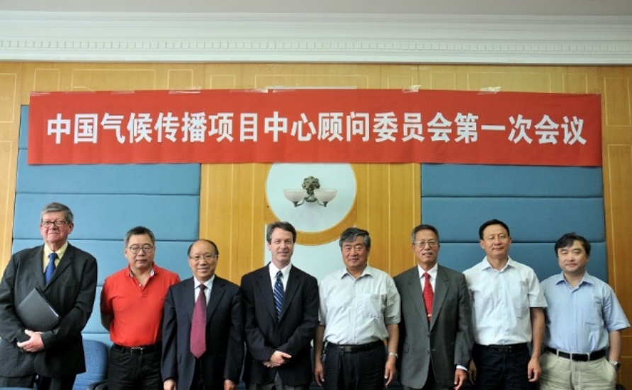 图为中国气候传播项目中心顾问委员会部分成员合影,左起Alex Kirby、苏伟、马胜荣、安东尼、何建坤、郑保卫、文步高、邹骥