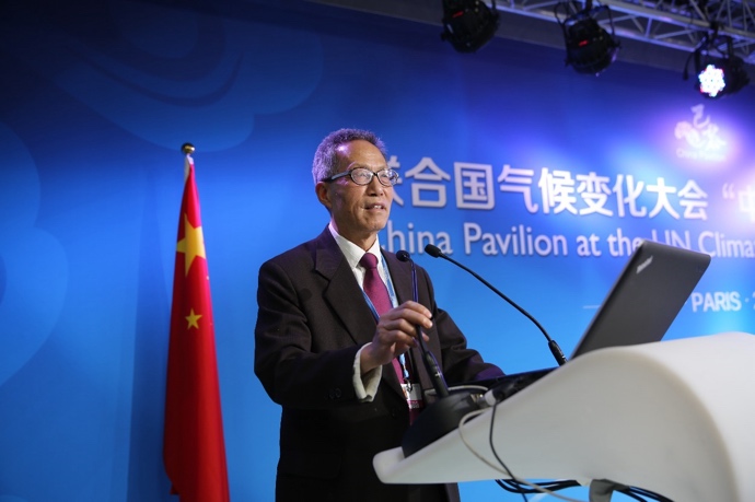 图为郑保卫主任在联合国可持续发展大会中国角主持气候传播国际边会