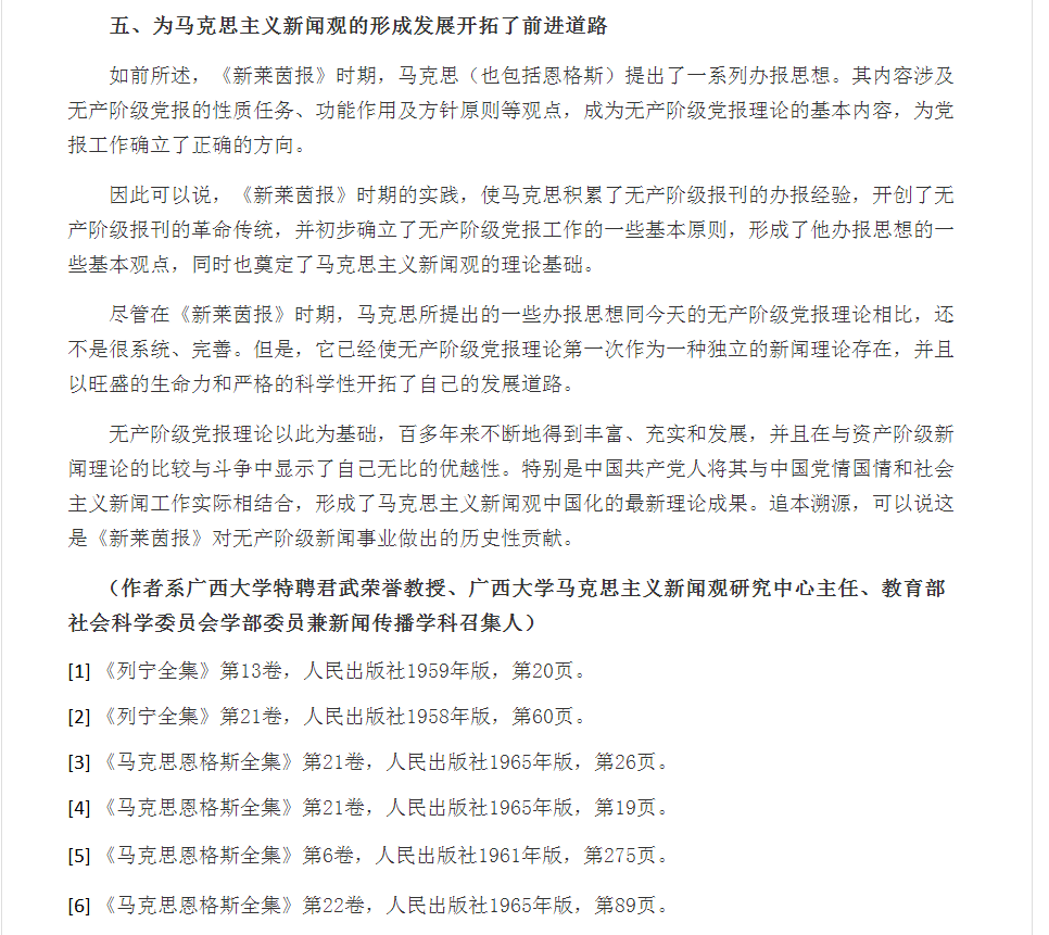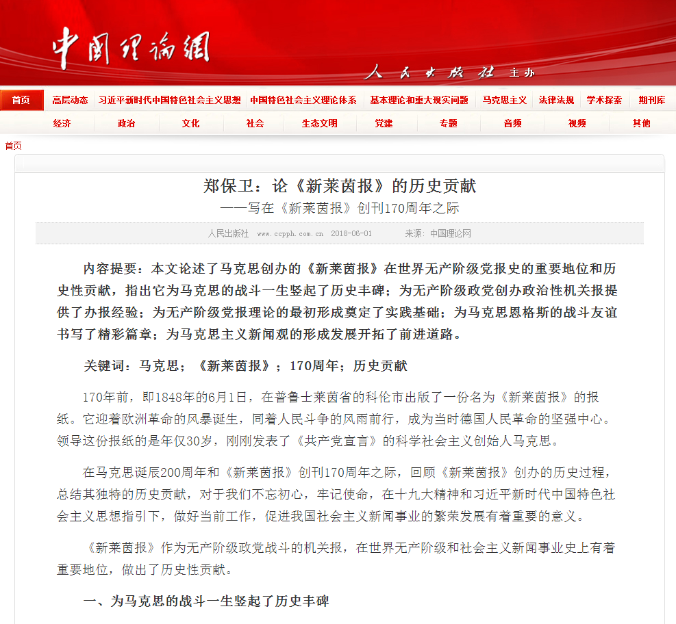 郑保卫院长在中国理论网发表头条文章《论<新莱茵报>的历史贡献————写在<新莱茵报>创刊170周年之际》