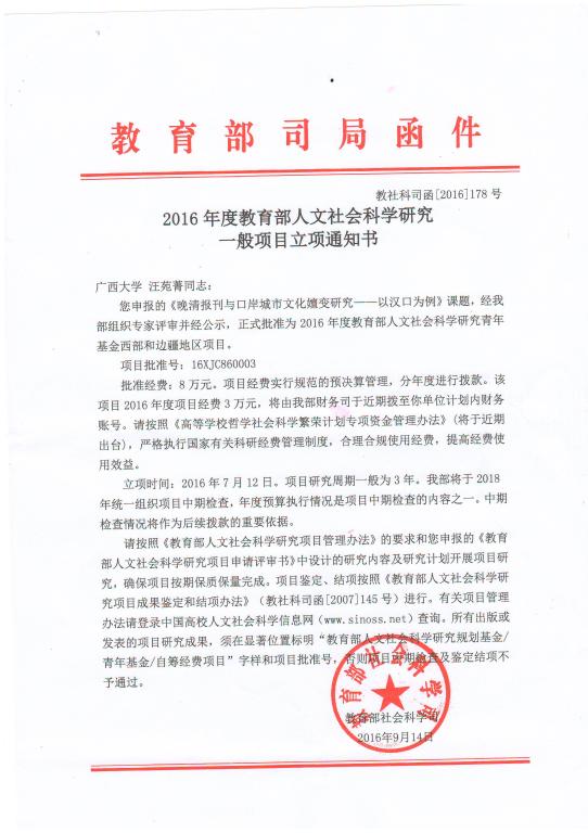我院汪苑菁博士2016年申报的教育部人文社科项目获立项