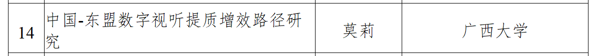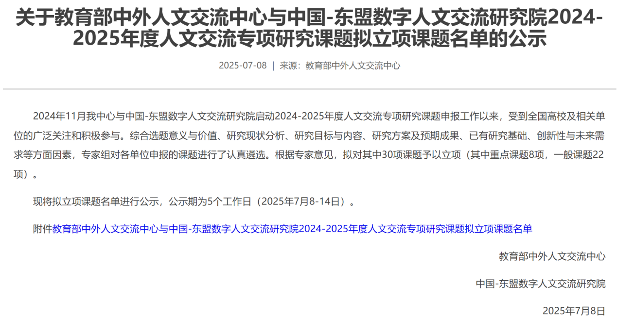 近日,教育部中外人文交流中心与中国-东盟数字人文交流研究院公布2024-2025年度人文交流专项研究课题立项通知,我院莫莉博士申报的一般课题“中国-东盟数字视听提质增效路径研究”获得立项。