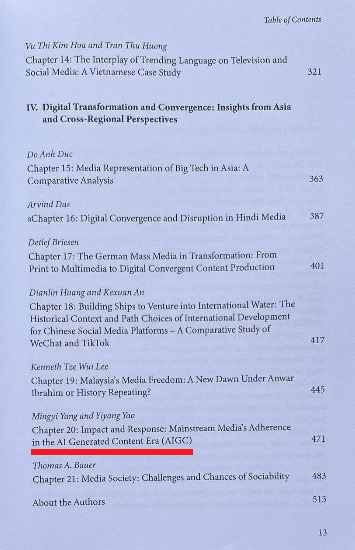 我院新闻系主任杨名宜副教授与2021级新闻专业本科生姚艺洋(现为中央民族大学太阳成集团tyc7111cc硕士研究生)合作撰写的论文《Impact and Response: Mainstream Media’s Adherence in the AI Generated Content Era (AIGC)》被收录于国际学术论文集《Digital Convergence in Media: Vietnam and Transnational Perspectives》。