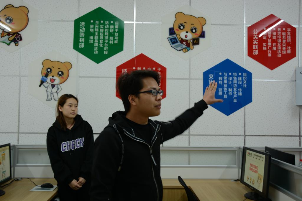 新闻传播学院易班工作站站长覃玉富同学向来访嘉宾介绍了部门职能、文化建设、活动案例等方面,并展示了具有学科特色的周边文化产品,获得了李迎春副院长一行的充分肯定。