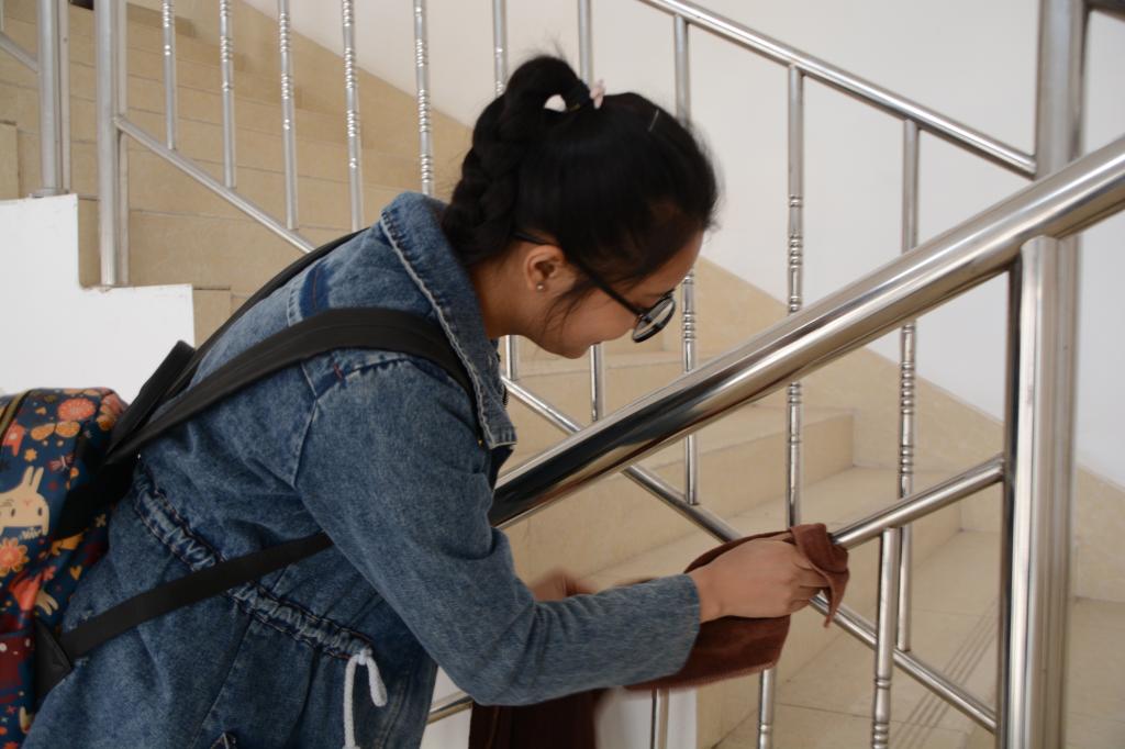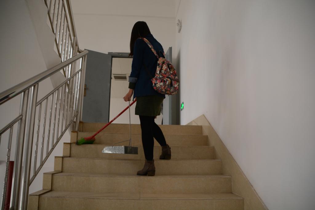 志愿者或手持扫把、撮箕,打扫地面上的垃圾;或手持抹布、水桶,擦拭楼梯上的灰尘。经过两个小时的努力,大楼变得更加整洁、干净了。