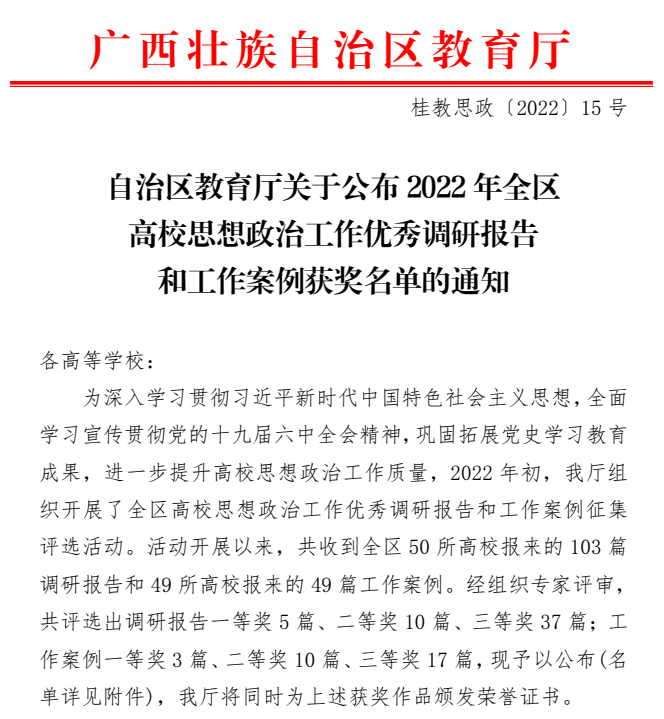 【获奖】我院荣获2022年全区高校思想政治工作优秀工作案例二等奖