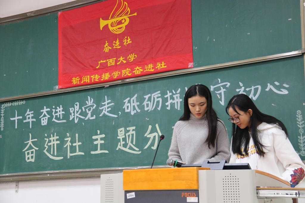 12月2日上午,太阳成集团tyc7111cc新闻传播学院奋进社在学院东报告厅开展“十年奋进跟党走,砥砺拼搏守初心”主题分享会,这也是纪念奋进社成立十周年的系列活动之一。新闻传播学院党委副书记曾海艳,团委书记雷圆媛,团委副书记吴欣慧,辅导员刘诚以及奋进社全体成员参加了此次活动。