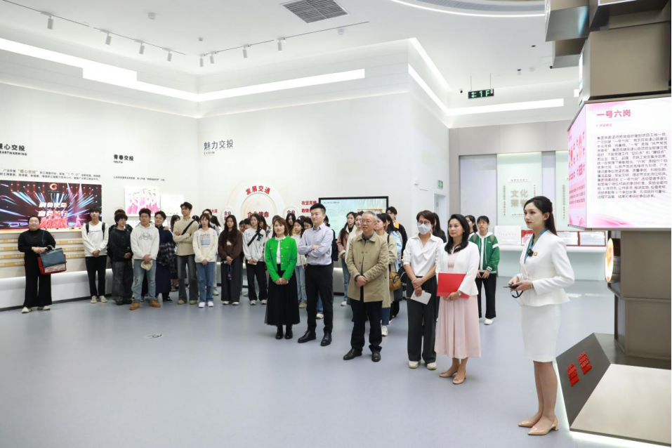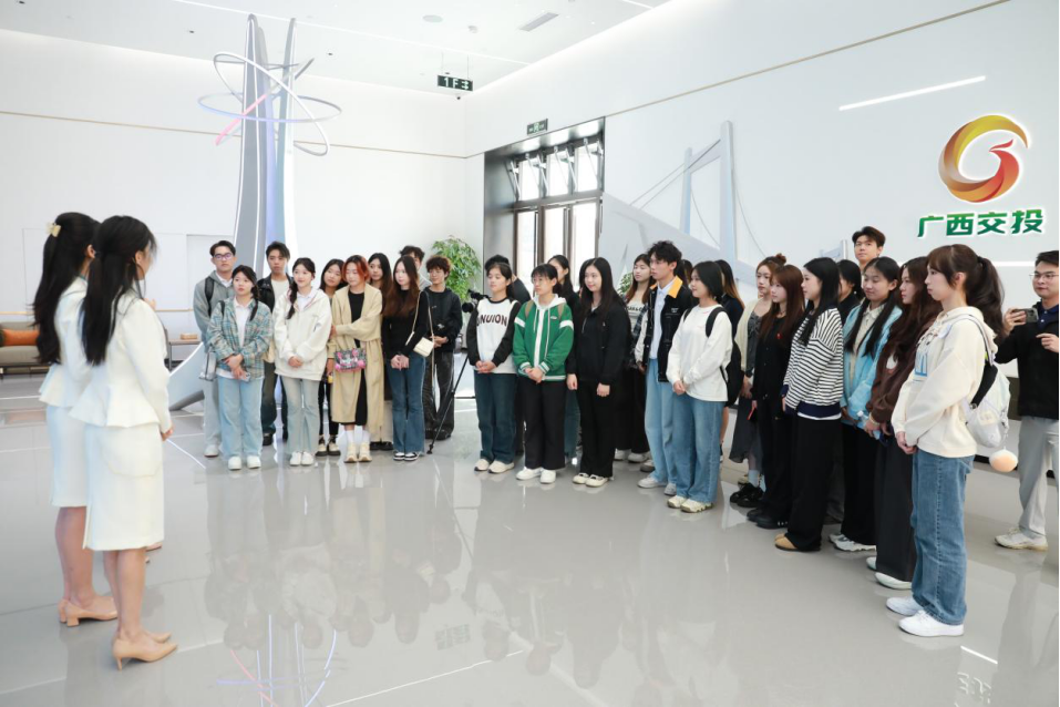 现就职于广西交通投资集团的我院播音与主持艺术专业 19 级毕业生朱梓宁、黄悦华引领全体师生参观交投展示馆。凭借其出色的讲解与语言表达能力,不仅使师生们深切体会到几代交投人攻坚克难铸就广西高速公路从无到有的辉煌历程——广西交投“牢记嘱托的奋进之路、争先创优的品质之路、勇担使命的先锋之路”,也为同学们树立起普通话语音专业学习的典范。