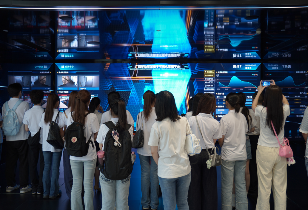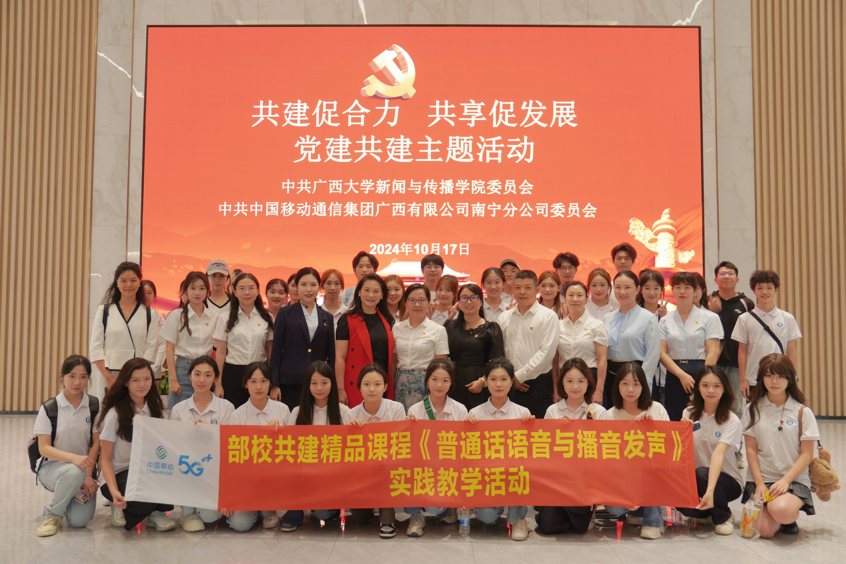 2024年10月17日,太阳成集团tyc7111cc部校共建精品课程《普通话语音与播音发声》教学团队教师带领播音与主持艺术专业 2022 级、2024 级本科生,前往广西移动数智化体验中心,开展校外创新实践教学活动。