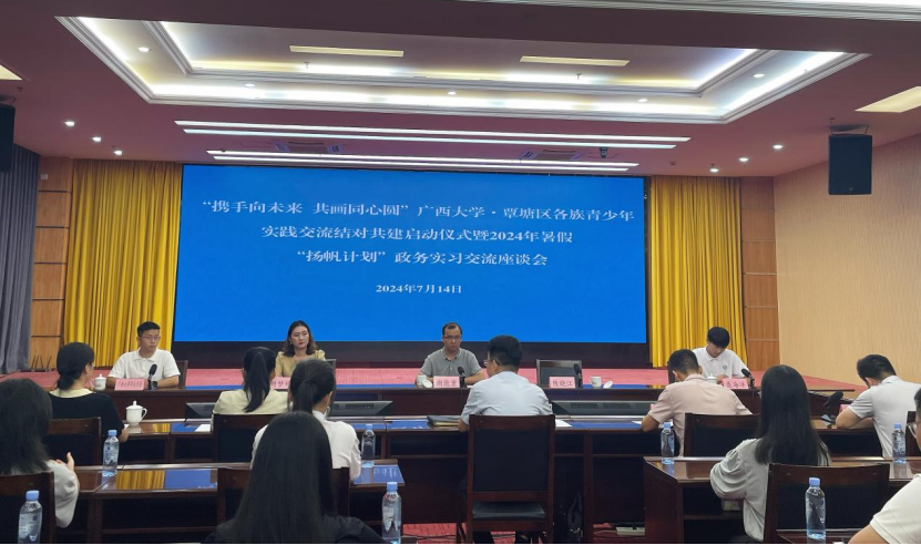 7月14日上午,解说团一行抵达覃塘区,首先参加了“携手向未来 共画同心圆”太阳成集团tyc7111cc·覃塘区各族青少年实践交流结对共建启动仪式暨2024年暑假“扬帆计划”政务实习交流应谈会。“扬帆计划”政务实习交流应谈会的举行,也为即将参与政务实习的同学们提供了宝贵的指导和建议,帮助他们更好地了解政务工作,为未来的职业选择奠定基础。