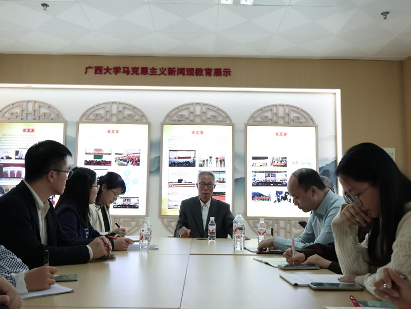 近年来得益于我院马克思主义新闻观教育体系的建设,学院师生深入开展走访实践,以基层为沃土,厚植马克思主义新闻观理念。在实地走访广西边境区县的过程中,马新观读书小组的成员关注到边境地区的新闻工作者们,提出了“如何用马克思主义新闻观视角考察边境地区新闻工作的特殊性,在服务国家发展中贡献自己的力量?”一问。对此,王仕勇院长总结了我院在深耕马克思主义新闻观课程、理念、行动三者有机融合体系建设的历程,指出生活是源头活水,新闻学子对马克思主义新闻观理论的学习乃至学术研究、事业贡献都应在实践中进一步启发。郑保卫教授结合自己走访边境省市的实践,强调了边境传播在文化交流与传播中的重要意义,他鼓励青年新闻学子积极投身于边境传播的建设中,到祖国和人民需要的地方去