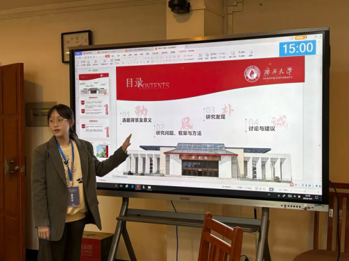 在张剑副教授指导下,2024级硕士研究生周雨欣在平行论坛一中以《媒介可供性视域下人工智能赋能广西—东盟传播的创新实践研究》为题作分享报告。在人工智能技术深刻影响国际传播的背景下,她聚焦广西面向东盟的相关传播实践,探讨如何以人工智能积极应对跨境传播中的文化折扣、单向输出与技术不平等困境。研究以媒介可供性理论作为核心分析框架,探索人工智能如何为内容生产、跨文化互动、跨境场景传播与跨国协同合作提供新型行动路径,最终为构建具有韧性、包容性与创新性的中国—东盟智能传播共同体贡献效能。