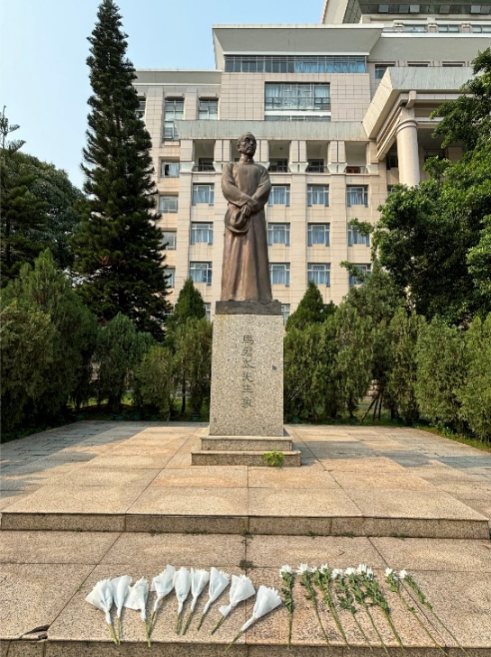 马君武校长雕像前的白菊花