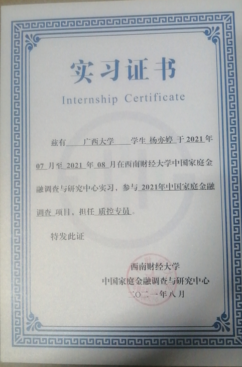 2021.7—2021.8,在西南财经大学中国家庭金融调查与研究中心实习