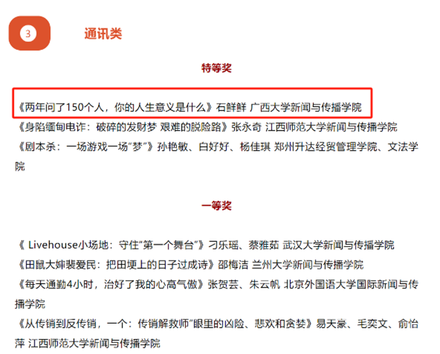 12月5日,由河南大学主办的第十二届铁塔记者文化节全国大学生新闻采写大赛获奖名单公布。在此次大赛中,我院2021级硕士研究生石鲜鲜同学的作品《两年问了150个人,你的人生意义是什么》荣获“通讯类”特等奖。