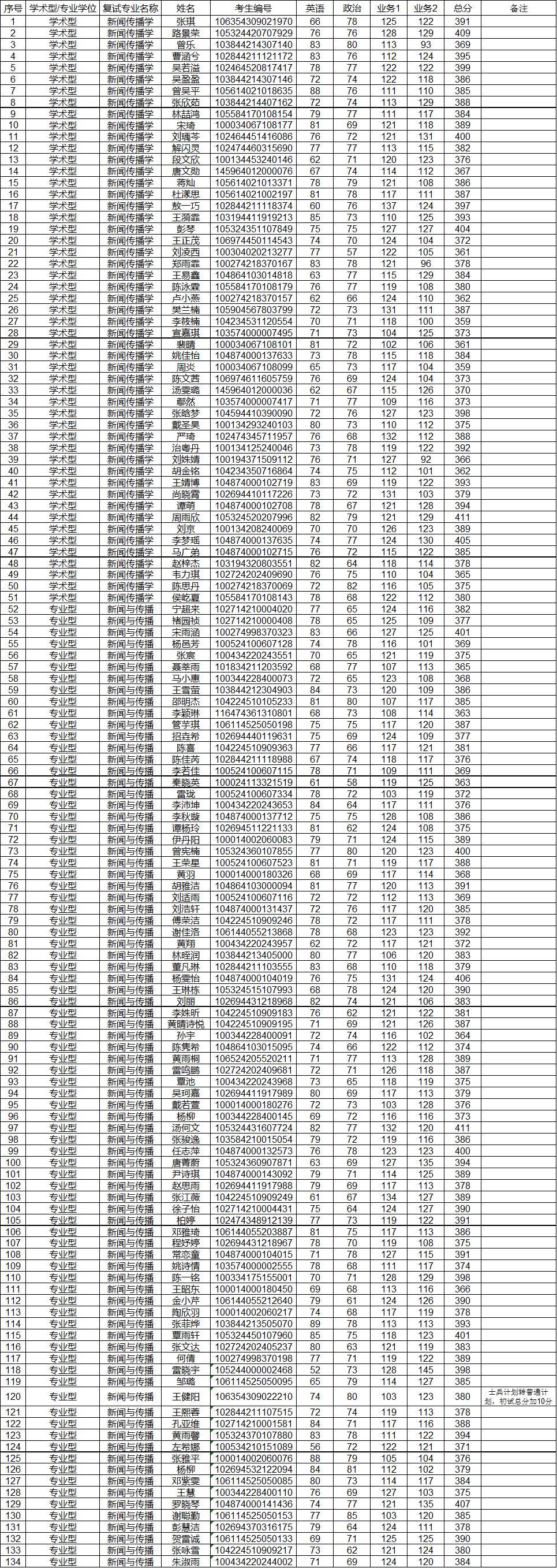 各位考生: 学院根据《太阳成集团tyc7111cc2024年硕士研究生招生复试实施细则》中的调剂基本条件,对申请同一专业、初试科目完全相同的调剂考生,按考生初试成绩择优遴选,现公布我院新闻传播学、新闻与传播调剂考生进入复试的名单。名单如下: