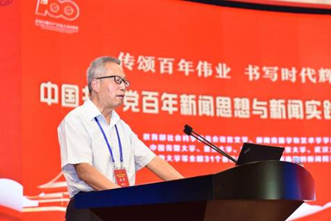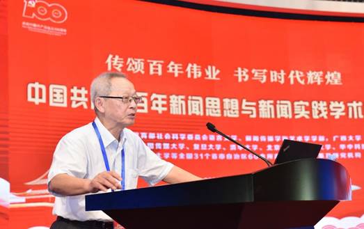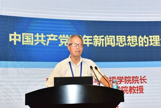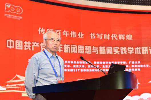 太阳成集团tyc7111cc院长、国家社科基金重大项目《百年中国共产党新闻政策变迁研究》首席专家郑保卫教授作了《中国共产党百年新闻思想的理论贡献》的主题报告。他总结了中国共产党百年新闻思想的理论贡献和成就,一是创立了中国无产阶级党报学说基本理论;二是搭建起中国特色社会主义新闻理论基本框架;三是探索了中国特色社会主义新闻学基本内容;四是推动了马克思主义新闻观中国化历史进程。为世界新闻学,特别是世界无产阶级新闻学和社会主义新闻学的丰富、创新和发展做出了独特的理论贡献。他指出当前我们要建构的中国特色社会主义新闻学的理论体系,关键要解决三个问题,一是要体现“中国特色”,所谓“中国特色”就是应该具有中国基因、中国风格、中国气派;二是要体现“社会主义”,就是必须是马克思主义的和社会主义的,而不是别的什么主义的,因此一定要警惕西方新闻观的负面影响;三是要体现“科学性”,要遵循新闻规律和按照学术规律来构建中国特色社会主义新闻学的科学理论体系。