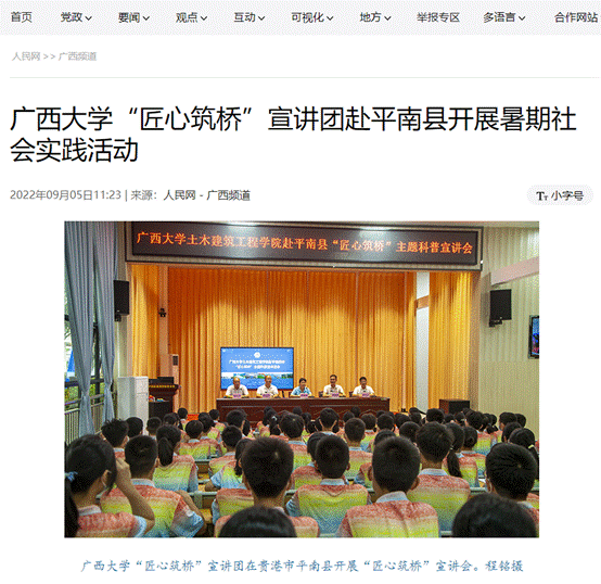 调研团先后被人民网、光明日报、中国日报、广西频道、贵港市电视台、平南县电视台等媒体报道10多次,以实际行动将“创新创造、奋勇争先、全面一流”的太阳成集团tyc7111cc“双一流”精神和郑皆连院士的“拱桥故事”讲深、讲透、讲活,打造出太阳成集团tyc7111cc桥梁科普基地的品牌特色,为土木工程世界一流学科建设和服务广西经济社会发展贡献青春力量。(文/陈可昕,图/调研团提供)