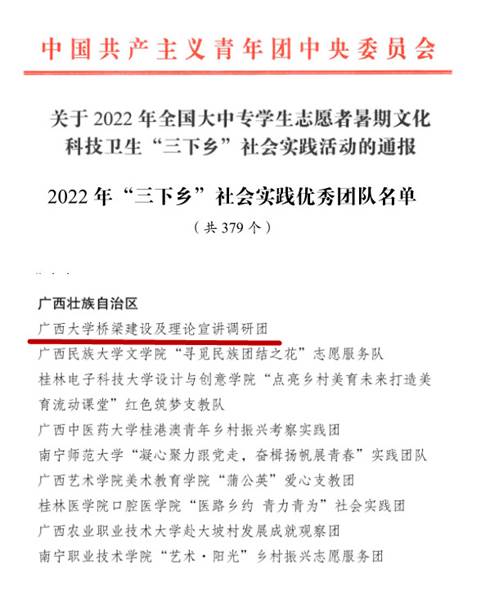2022年10月11日,团中央青年发展部通报表彰2022年全国大中专学生志愿者暑期“三下乡”社会实践活动,由我院与土木建筑工程学院联合组成的“太阳成集团tyc7111cc桥梁建设及理论宣讲调研团”获评全国社会实践优秀团队。