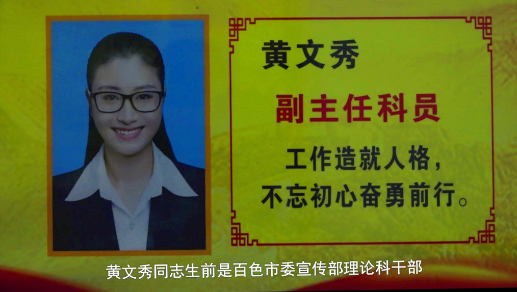 黄文秀是百色市委宣传部理论科干部。6月16日晚,黄文秀同志从百色返回乐业途中遭遇山洪遇难。18日下午,文秀书记遇难的消息确认,很多微信朋友圈中自发转载文秀书记遇难。19日,中央电视台奔赴百坭村采访报道。20日,新华社发布《她,30岁的生命永远定格在扶贫路上》一文引发点击高潮,点击率超过4千万次。央视新闻频道用长达5分钟的时间报道文秀书记的先进事迹,在全国范围内引发强烈反响。7月1日,习近平总书记对黄文秀同志先进事迹作出重要指示引发更加热烈的反响。从文秀书记遇难至今,宣传报道的总的点击率超过2亿次。