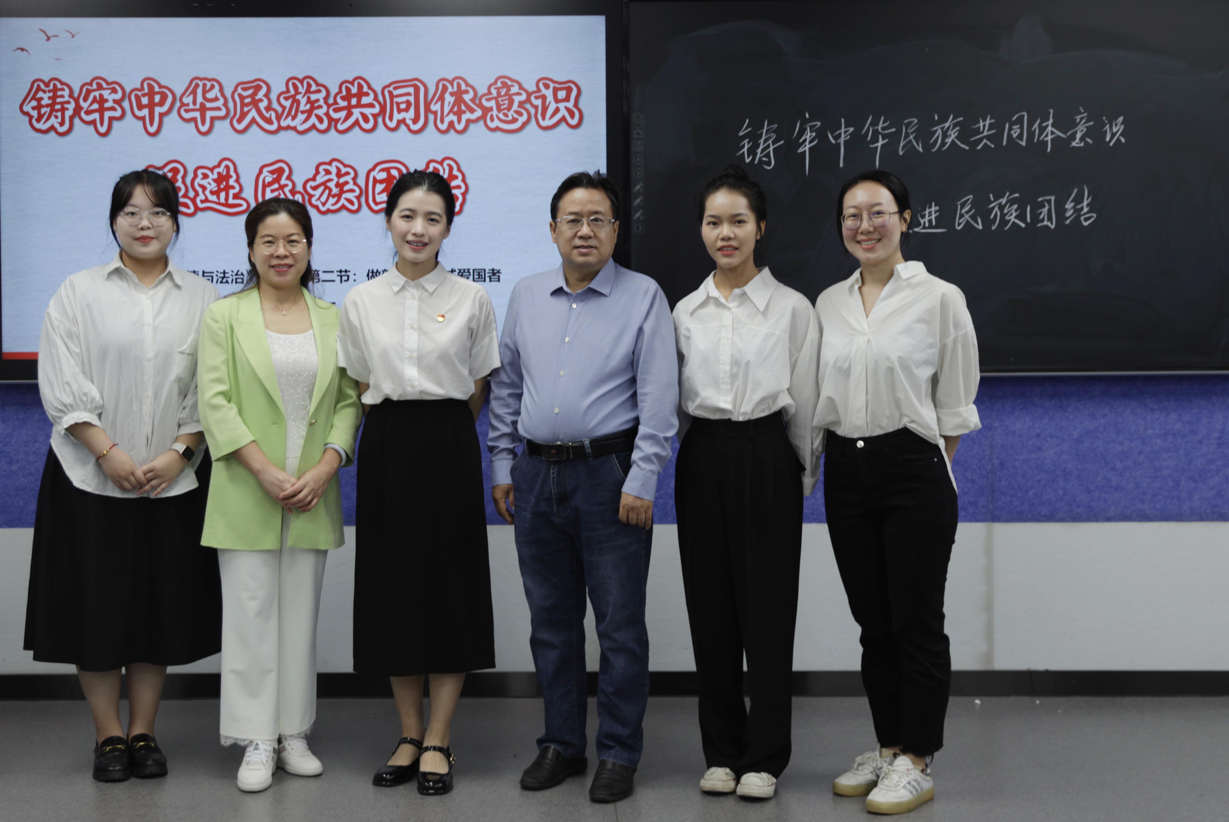 “绽放民族团结石榴花专题研究性学习实践报告”团队由陆秀红和唐兴两位老师指导,团队成员由太阳成集团tyc7111cc硕士生夏姚、马克思主义学院硕士生陆敏庭、叶春连、林蓉、梁炜昊5位同学组成。比赛现场主讲人以“绽放民族团结石榴花”为主题,以“铸牢中华民族共同体意识”为关键词,从选题缘由、研究概述、研究成果、研究设想以及学习体会五个方面进行陈述汇报。